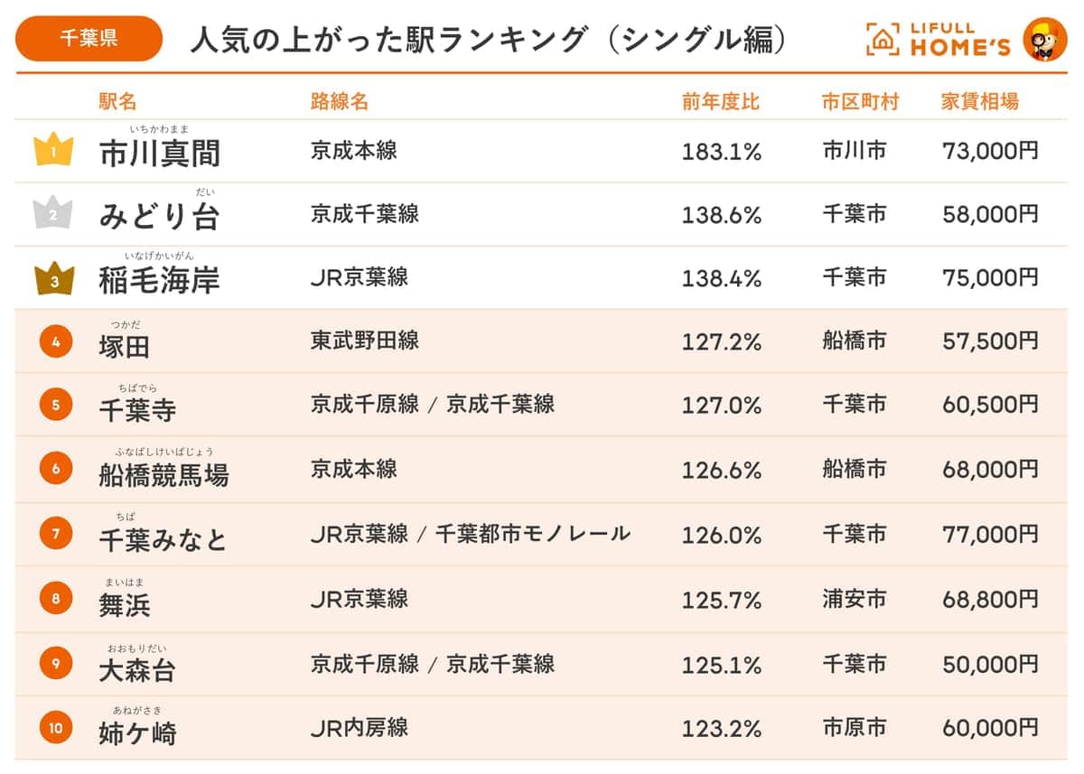 シングルの人気の上がった駅ランキング【千葉県編】 3位「稲毛海岸」、2位「みどり台」、1位は?