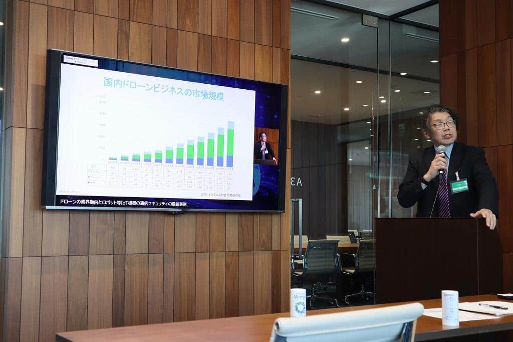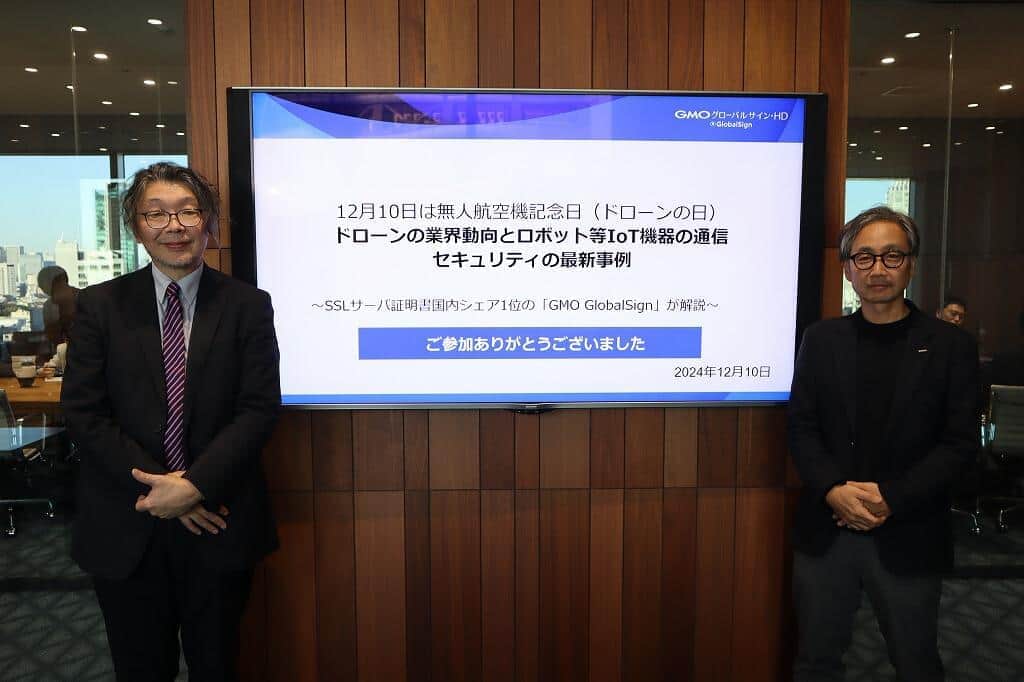 GMOグローバルサインHDのCTO室・浅野昌和室長(右)とドローン・ジャパンの春原久徳取締役会長(左)が登壇