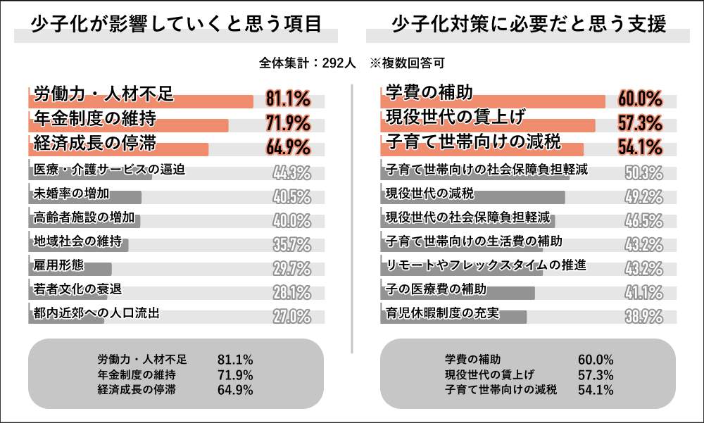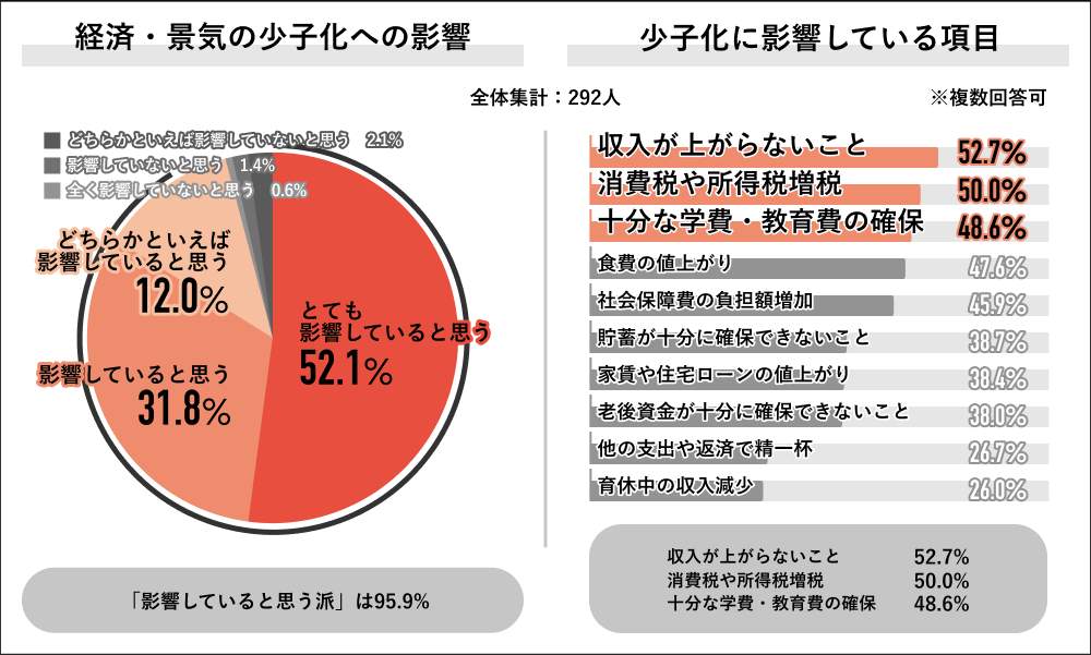 経済・景気が少子化に及ぼす影響は? 3位「十分な学費・教育費の確保」、2位「消費税や所得税増税」、1位は?