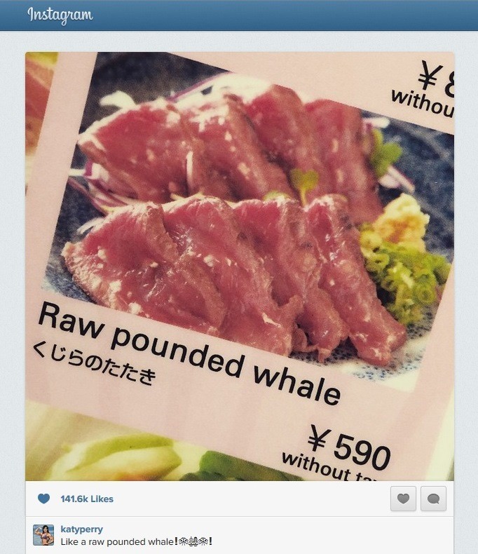 ケイティ・ペリー、来日中の「クジラ肉」写真が物議 外国人ファン激怒「失望した」「恥ずべき投稿!」