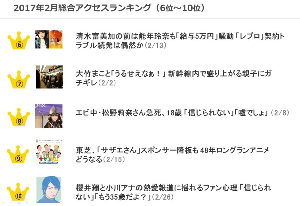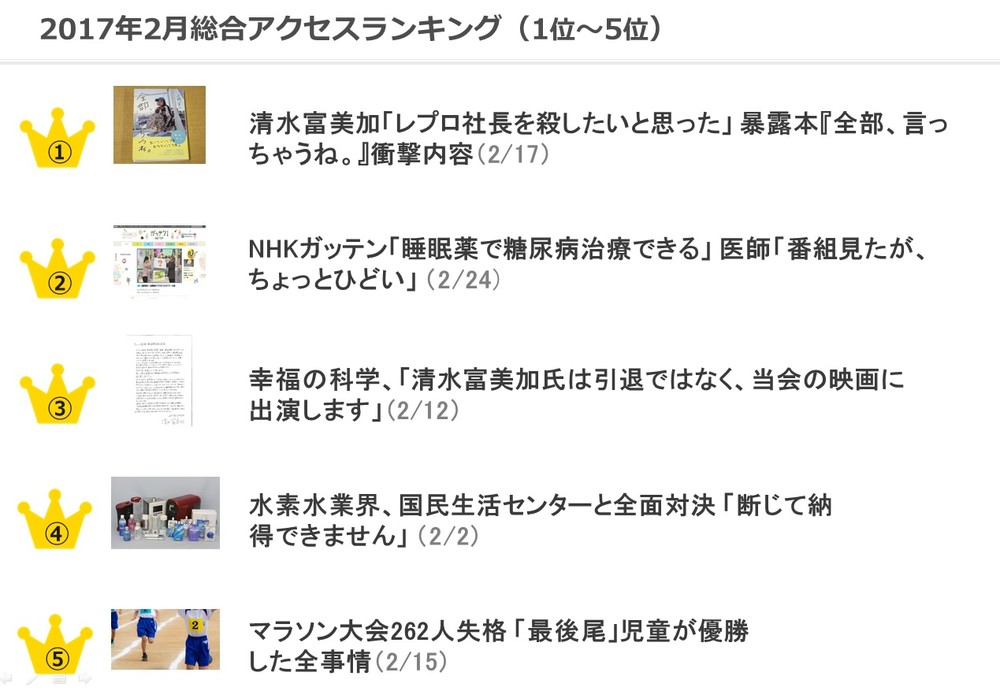 J-CASTニュースランキング 2月は「清水富美加出家」に集中