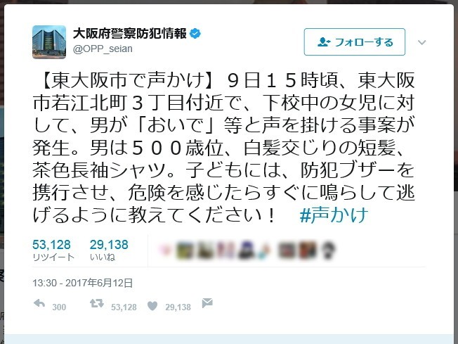 「500歳位」の男が女児に声かけ 警察ツイッターに「時空を超えた冒険が待ってそう」