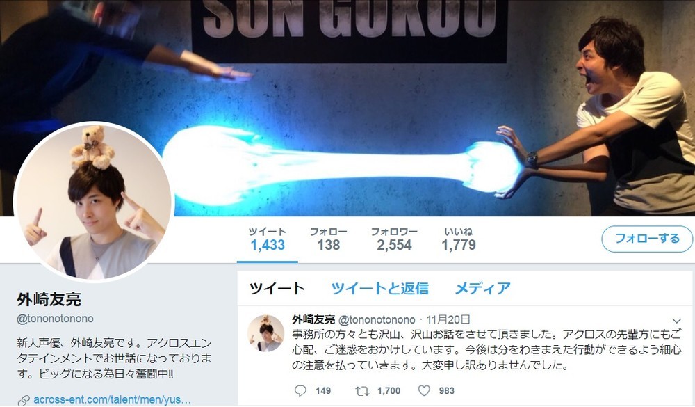 男性声優の「不適切発言」でまさかの事態(画像は外崎友亮さんの公式ツイッター)