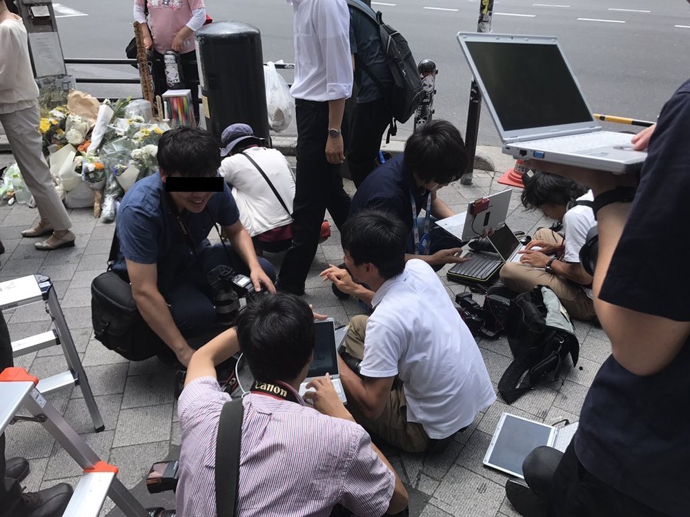 献花台そばに座り込み、PC広げ... 「空気読めぬ」一部マスコミに顰蹙