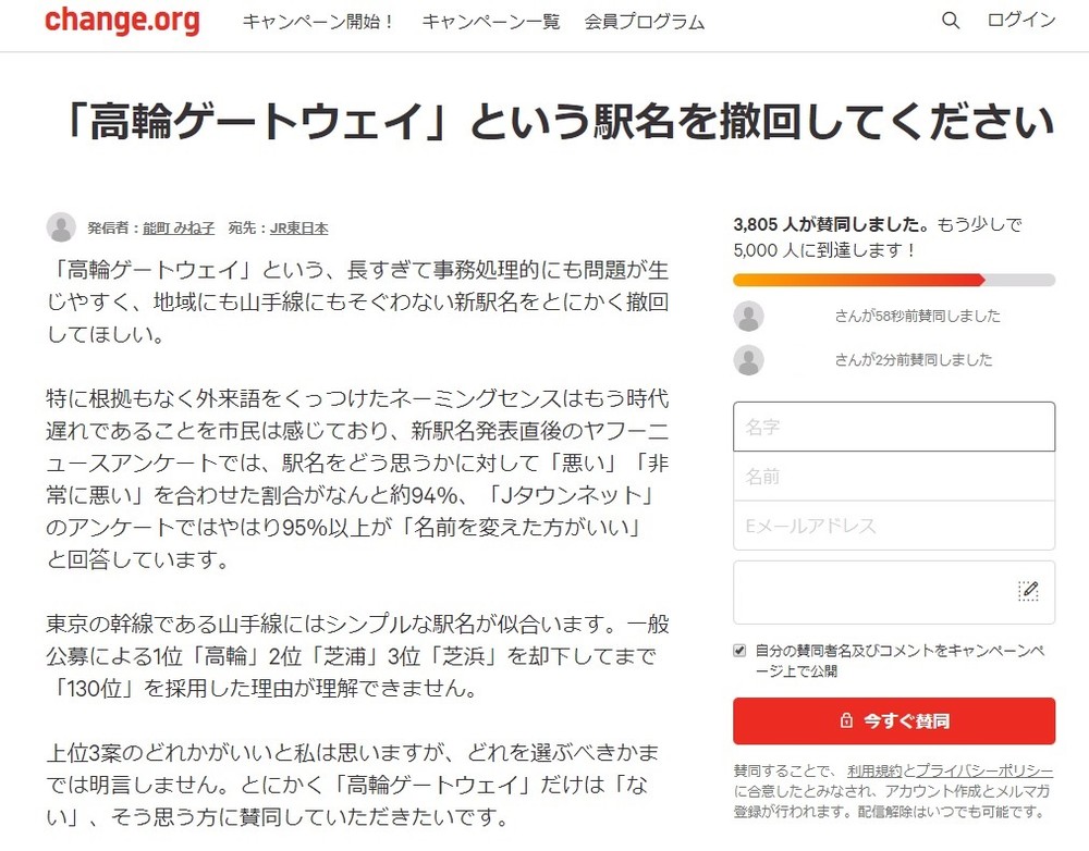 撤回署名運動のページ。賛同者は増え続ける