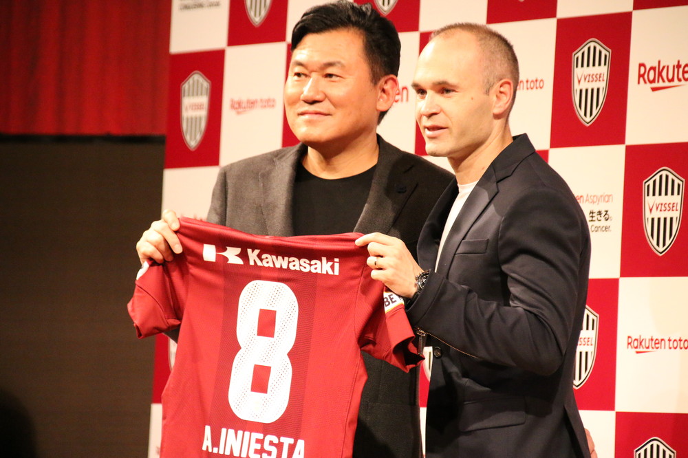複数の得点シーンに絡んだアンドレス・イニエスタ(写真は2018年5月、ヴィッセル神戸の三木谷浩史オーナーと臨んだ入団発表会見)
