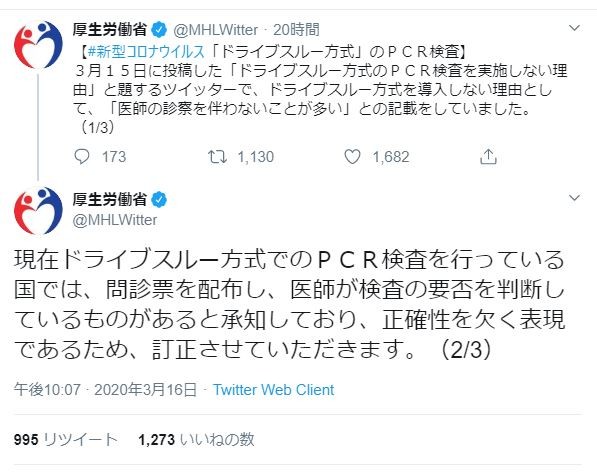 厚労省「ドライブスルー方式」ツイートでも一部訂正 投稿翌日に「正確性を欠く」