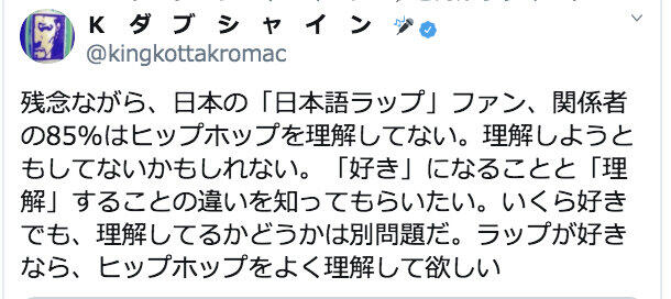 Kダブシャイン「日本の『日本語ラップ』ファン、関係者の85%は...」 ツイッターで持論