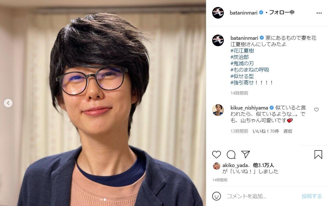 山崎アナが「鬼滅の刃」花江夏樹に変身、夫・おばたのお兄さんが公開 メガネ、微笑み...「似てる」の声
