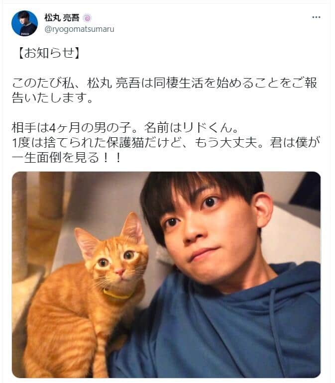 松丸亮吾「同棲生活を始めることをご報告いたします」 お相手は「めちゃくちゃ可愛い」保護猫