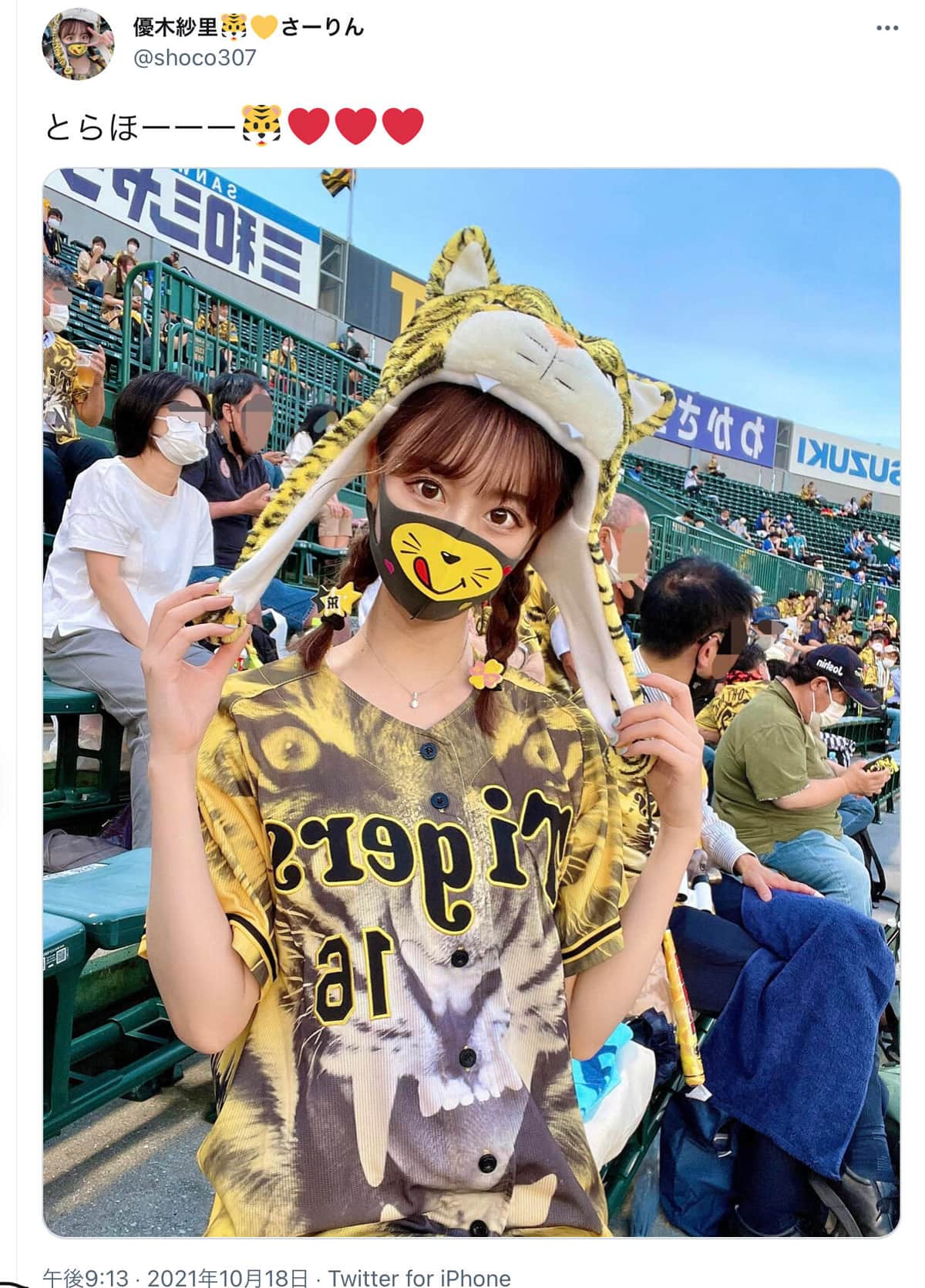 阪神ファンのグラビアアイドル・優木紗里さん(10月18日の投稿より)