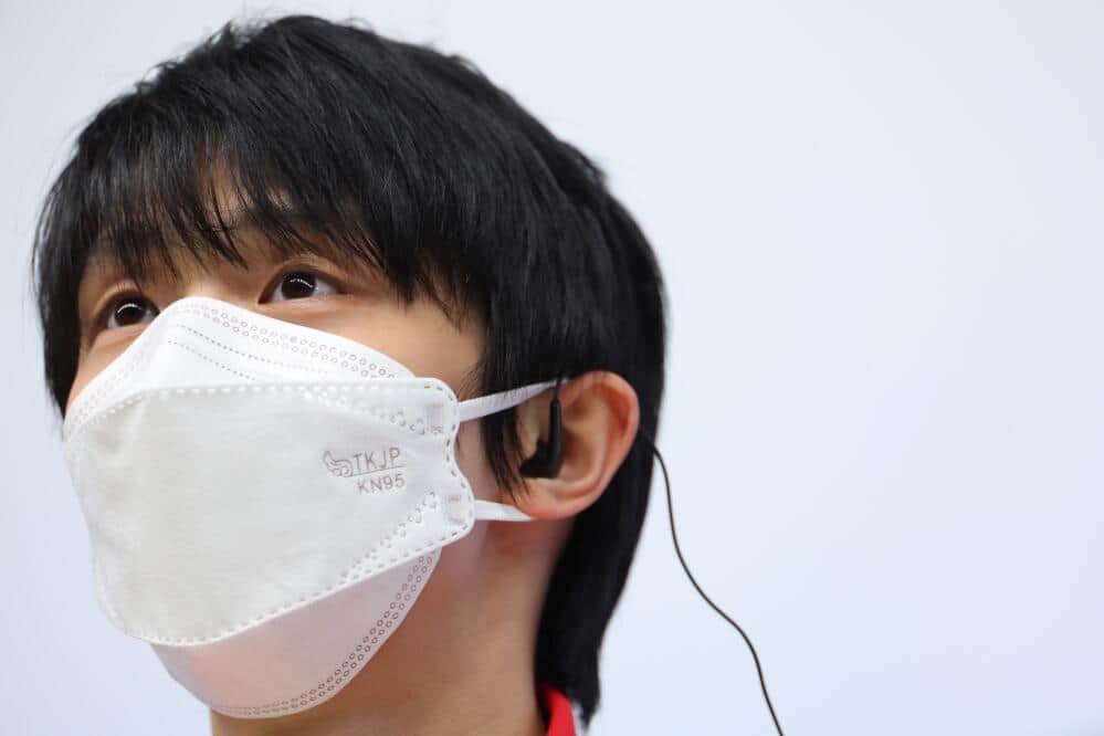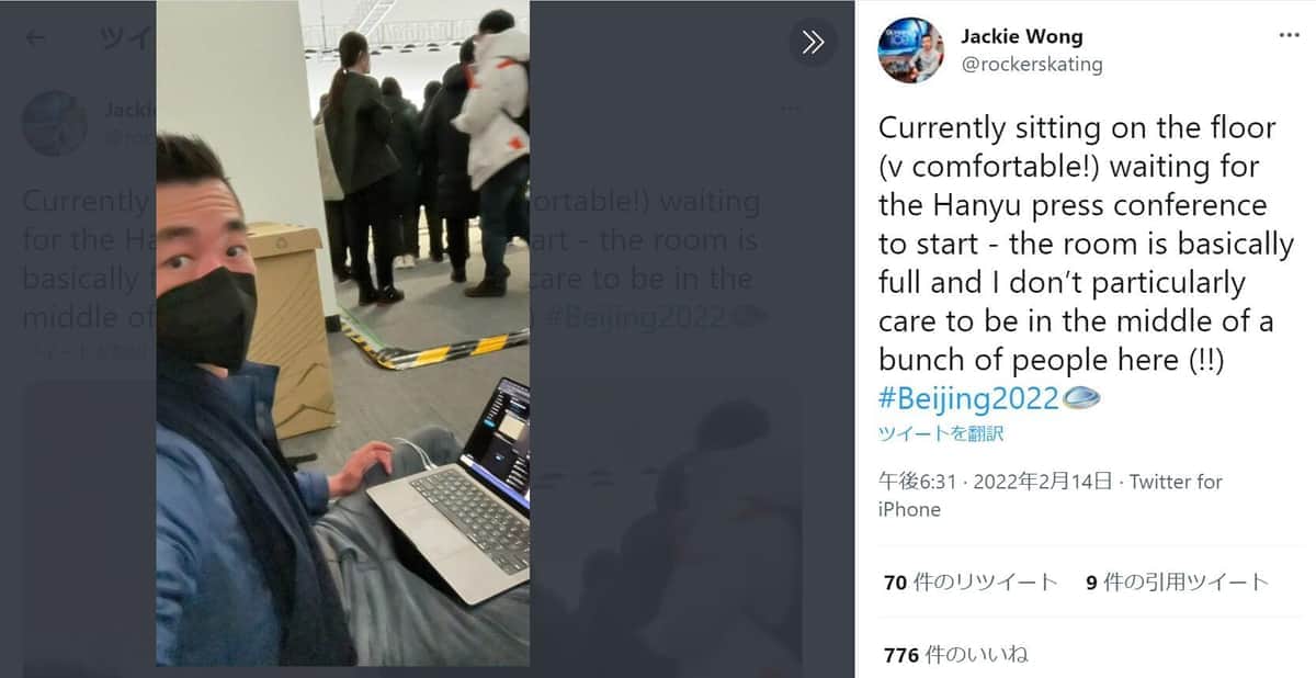 羽生選手の会見を取材していたウォン記者(ウォン記者のツイッターより)