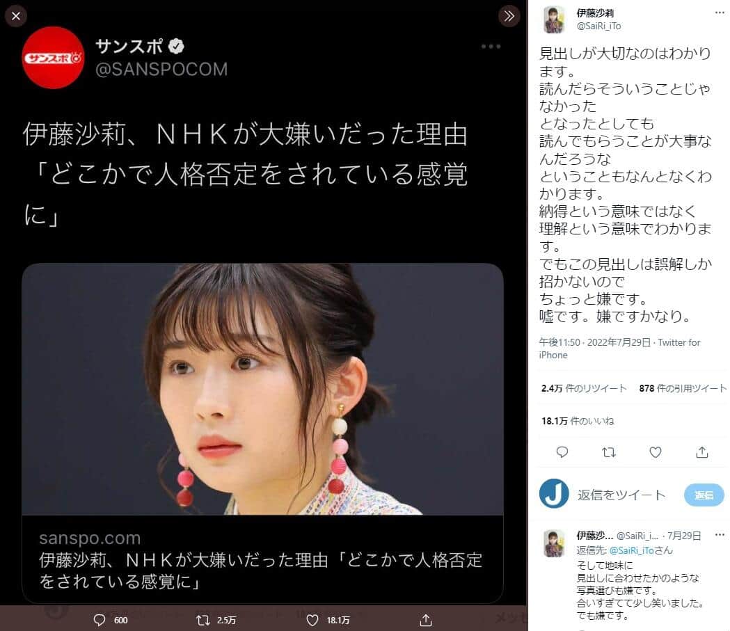 伊藤沙莉さんが指摘したサンスポ記事。伊藤さんのツイッター(@SaiRi_iTo)より