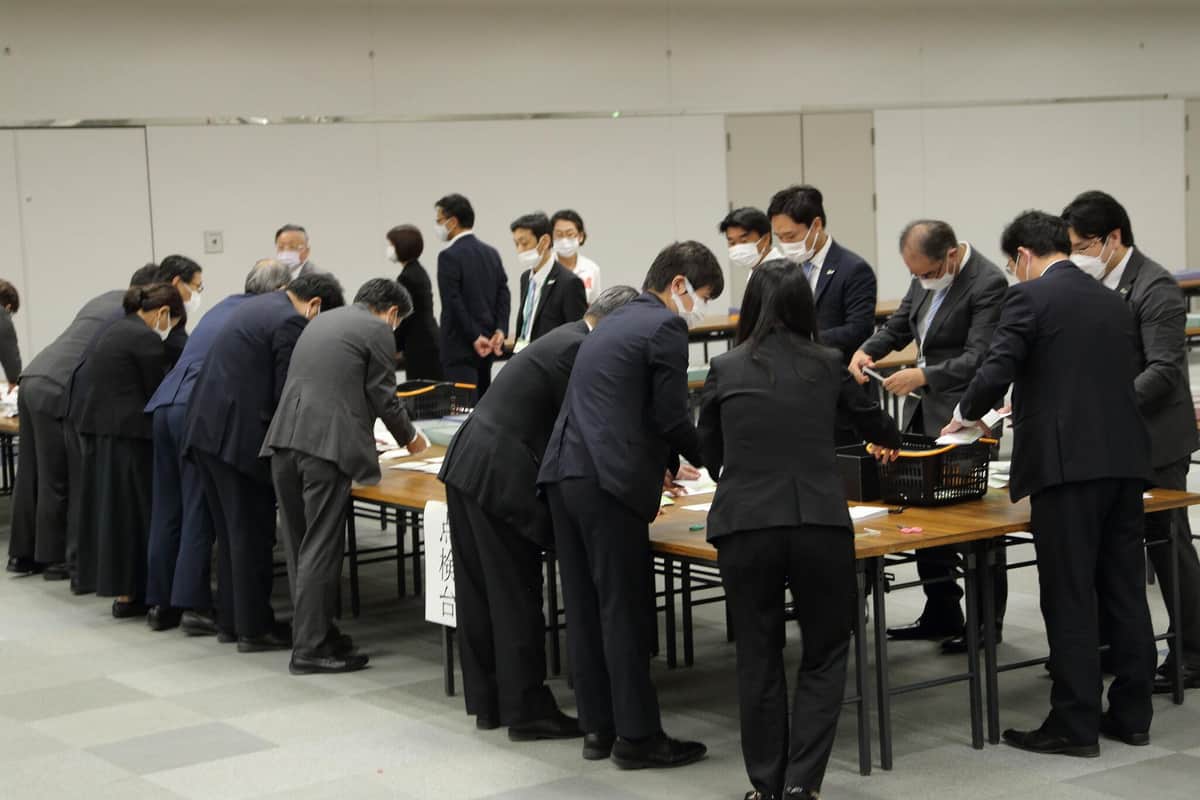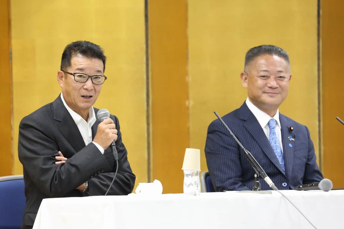 日本維新の会の新代表に選ばれた馬場伸幸氏。松井一郎前代表(右)から事実上の後継指名を受け、代表選に圧勝した