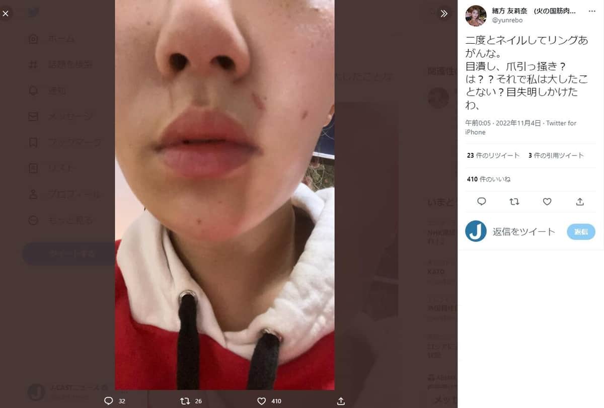 緒方さんの顔に残ったひっかき傷(本人ツイッター@yunrebo)より