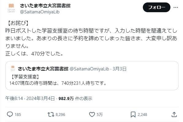 さいたま市立大宮図書館、待ち時間表示ミスで「お詫び」 「470分待ち」が「740分待ち」、どっちも長すぎて「ほぼ誤差で草」の声