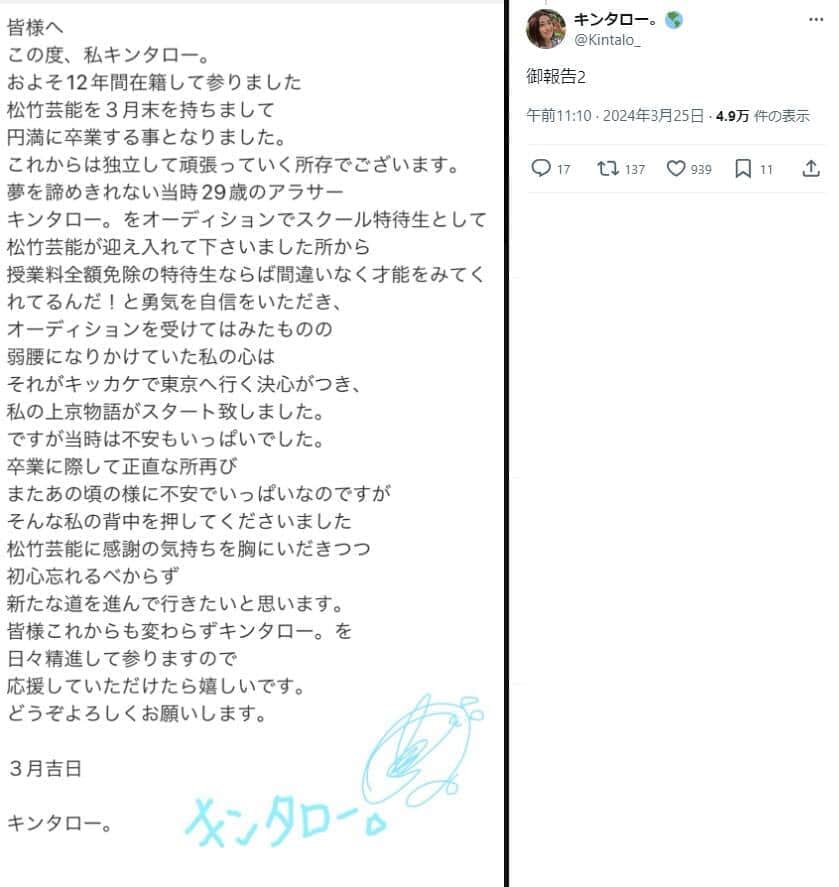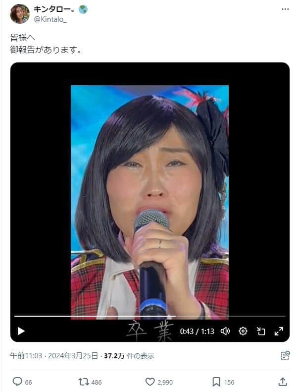 キンタロー。が前田敦子ものまねで「松竹芸能を卒業します!」 退所報告に「むっちゃ良い」「芸人やなぁ」の声