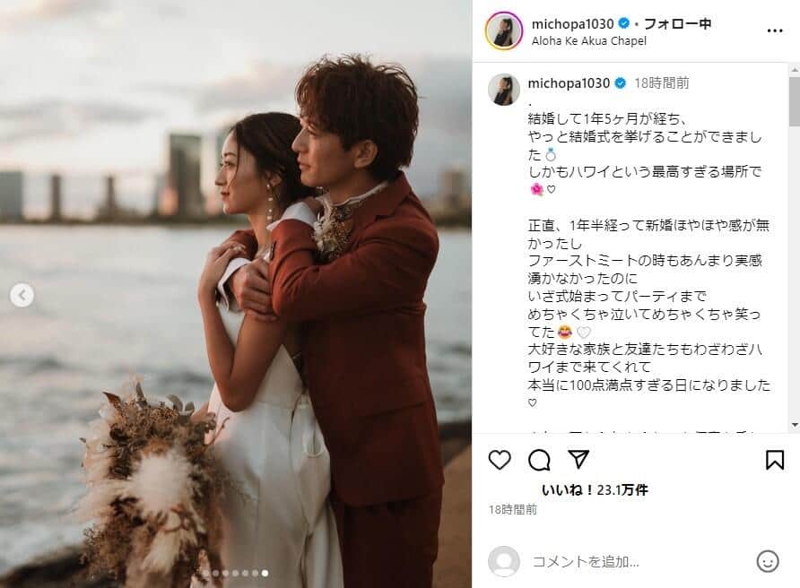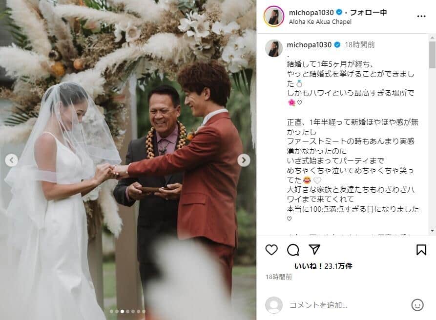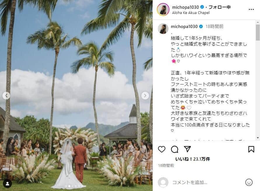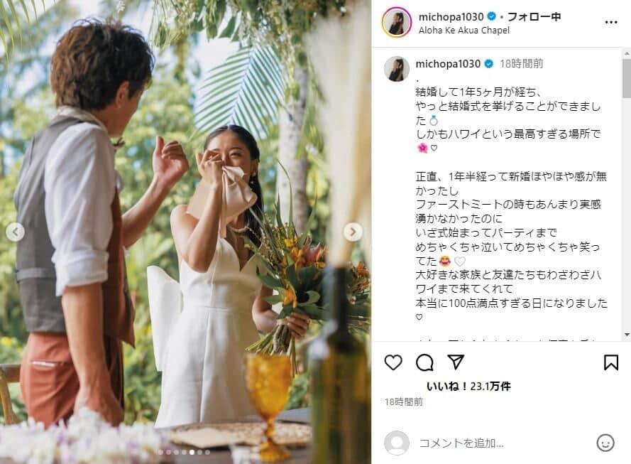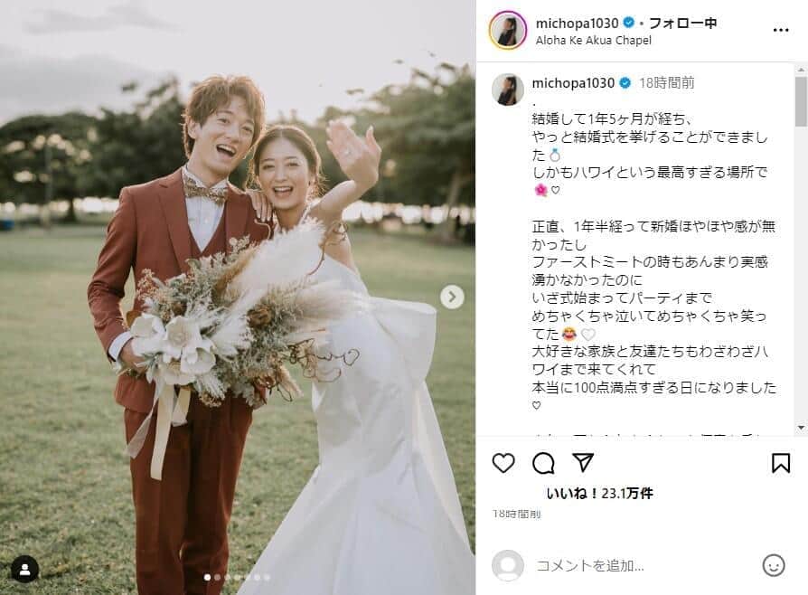 みちょぱ&大倉士門夫婦は「お顔がそっくり」? ウェディングドレス姿で「最高の1日」...ハワイでの挙式報告に反響