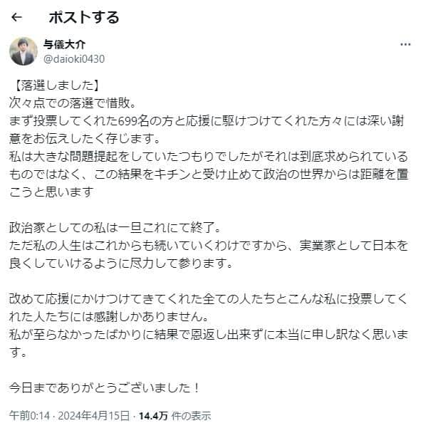 おかもとまり再婚の夫・与儀大介市議、落選で「都内の何処かに引っ越し」へ 「子どもはまた転校するの?」ネット懸念