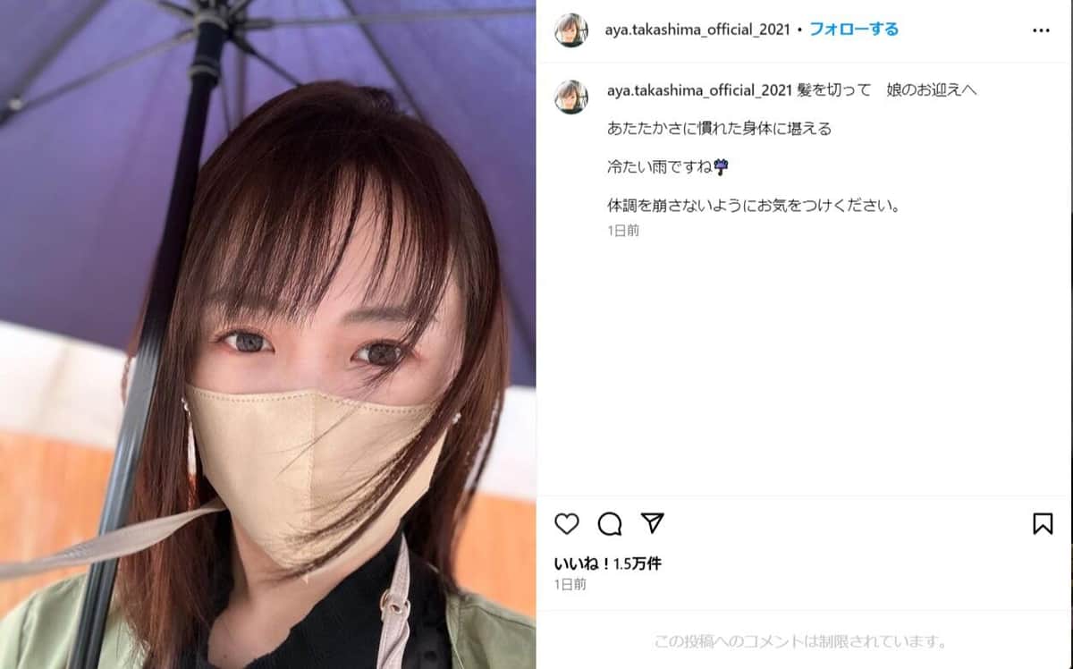 高島彩、ミディアムボブヘアにヘアカット→娘のお迎えへ 「別人になったよう」「髪型新鮮」