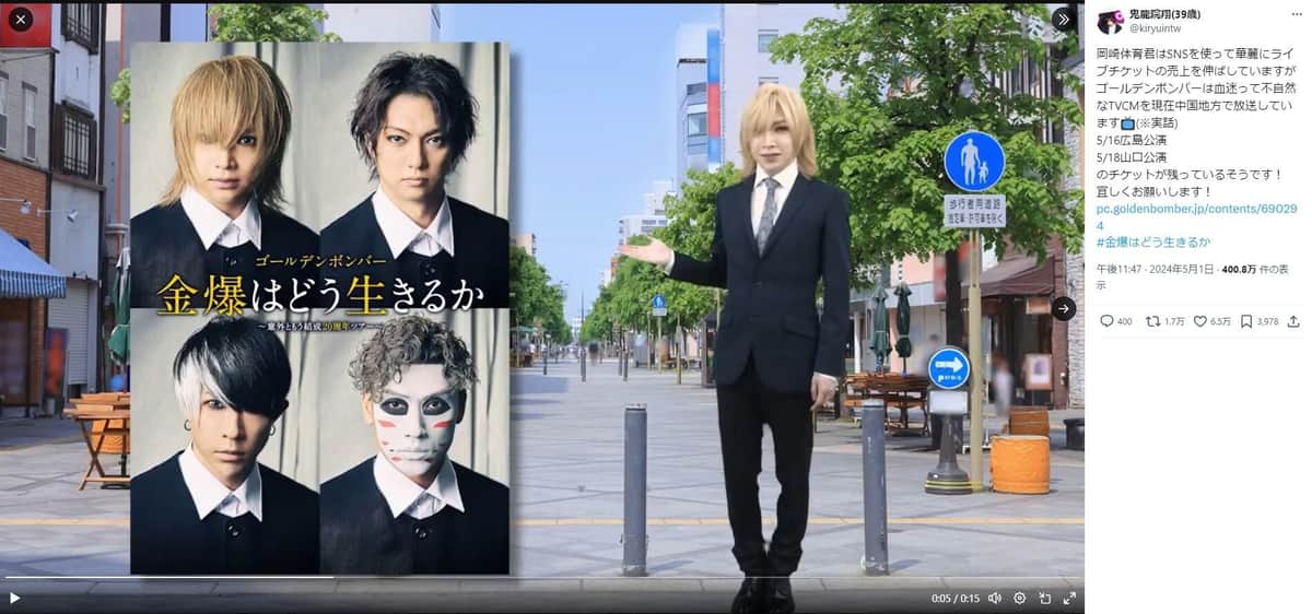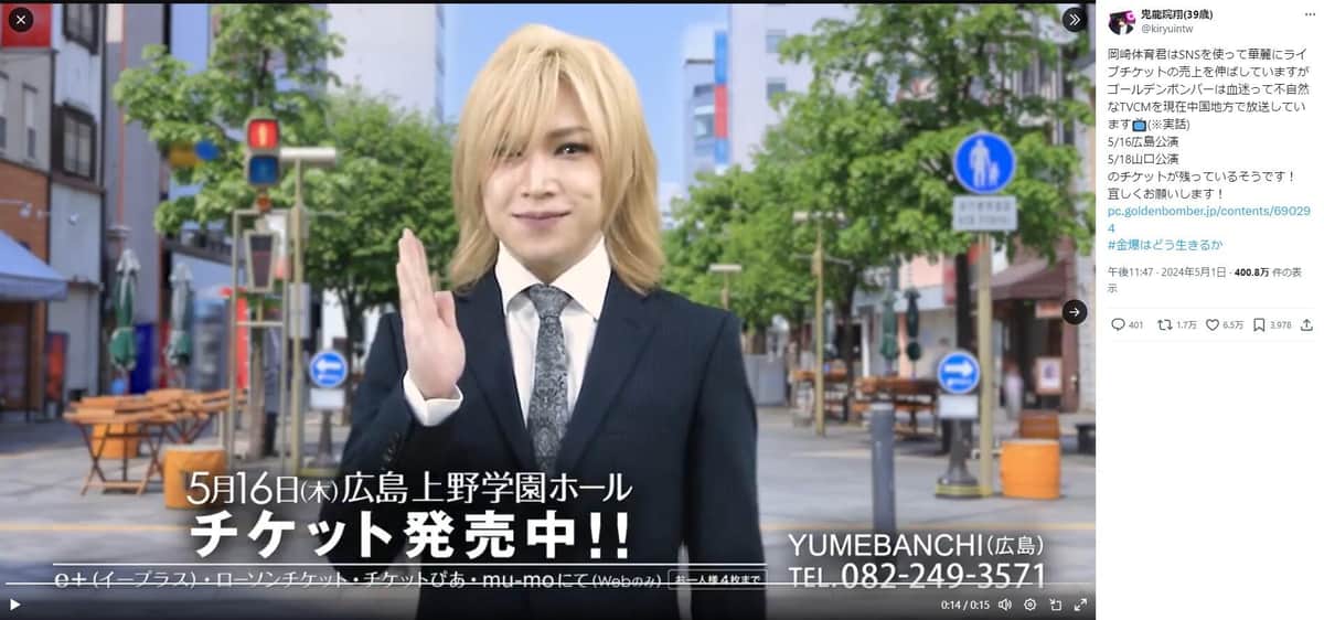 ゴールデンボンバー、チケット売れ残り...鬼龍院翔「不自然な」テレビCM放映 ネット爆笑「ライブ宣伝と思えないテンション」