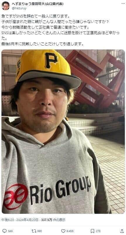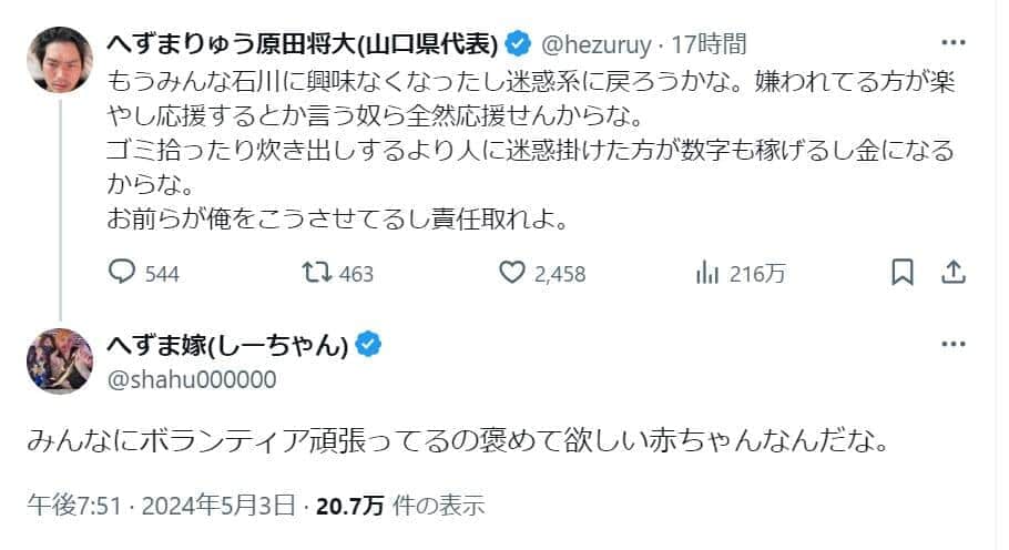 へずまりゅう、「迷惑系に戻ろうかな」→2時間後に撤回 妻は痛烈指摘「褒めて欲しい赤ちゃんなんだな」