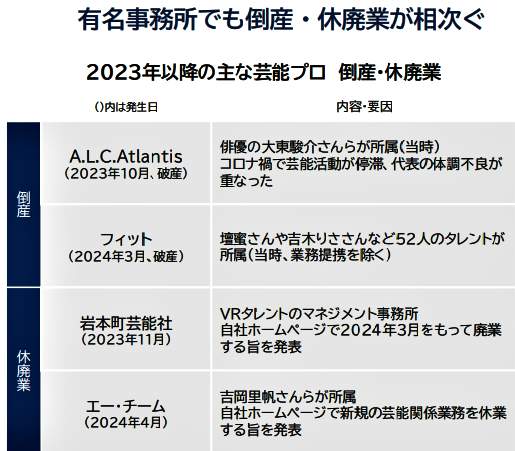 芸能プロ倒産ラッシュの背景とは 「フワちゃん」と「旧ジャニーズ事件」の影響も?所属タレント独立も逆風