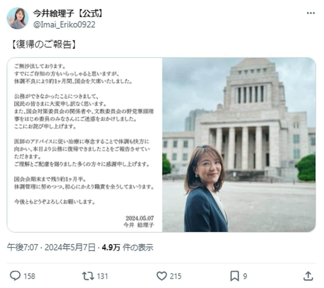 自民・今井絵理子議員がX削除→1か月半で新アカ開設 その理由に憶測...仏視察「早く報告書を出すべき」の声も