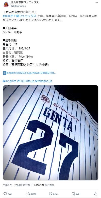 元レぺゼンフォックス「DJ銀太」がプロ野球選手「GINTA」に 名門・東福岡高校時代は「スタンド」、独立リーグでは内野手登録