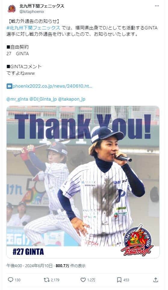 球団の戦力外通告の発表。GINTAさんは「ですよねwww」
