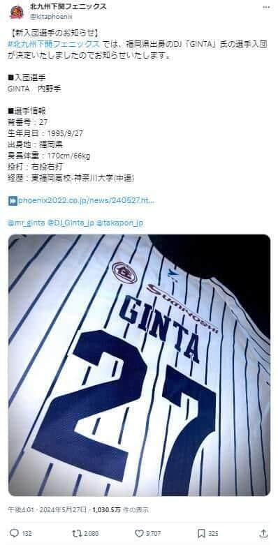 GINTAさんの入団を知らせた球団のX投稿