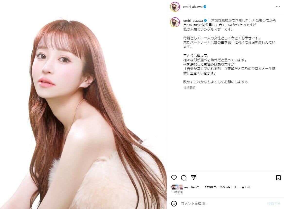 「今とても幸せ」元キャバ嬢・愛沢えみり、未婚シングルマザー公表 「娘の事を第一に考えて」パートナーと育児中