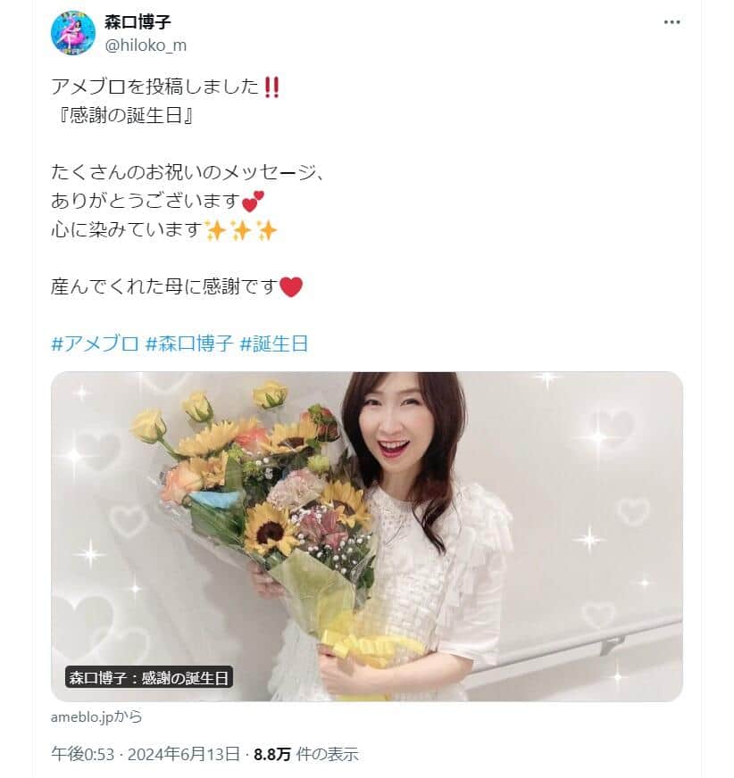 「いつまでも綺麗」森口博子56歳「誕生日」報告 「年々お美しくなっちゃってませんか?」