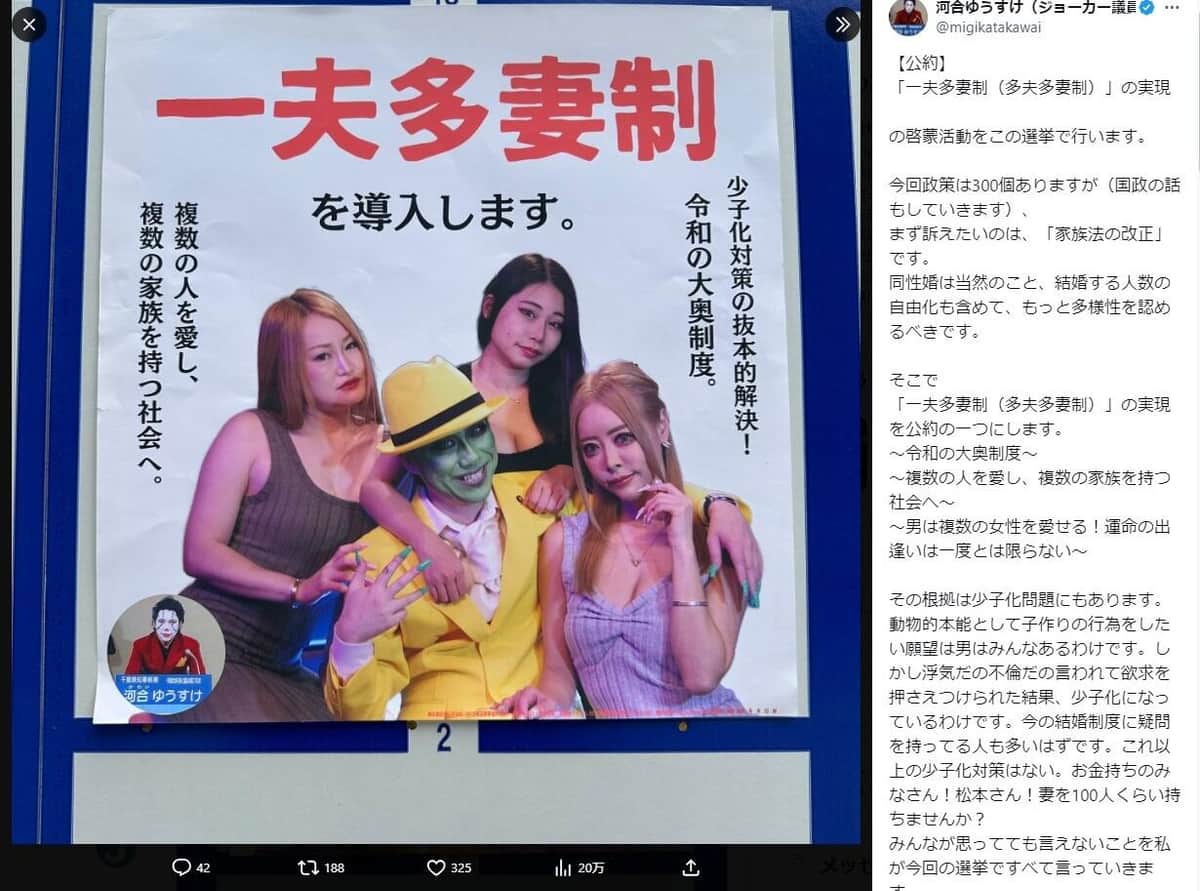「ほぼ全裸」ポスター通じて「女性の性表現の自由について取り上げたく」 候補者が取材に持論展開、「一夫多妻制」も主張