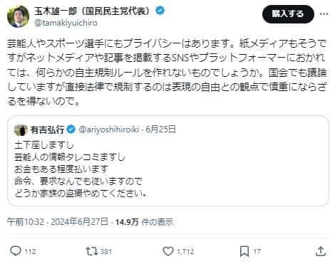 国民民主党・玉木雄一郎代表のポスト。「何らかの自主規制ルール」を求めている