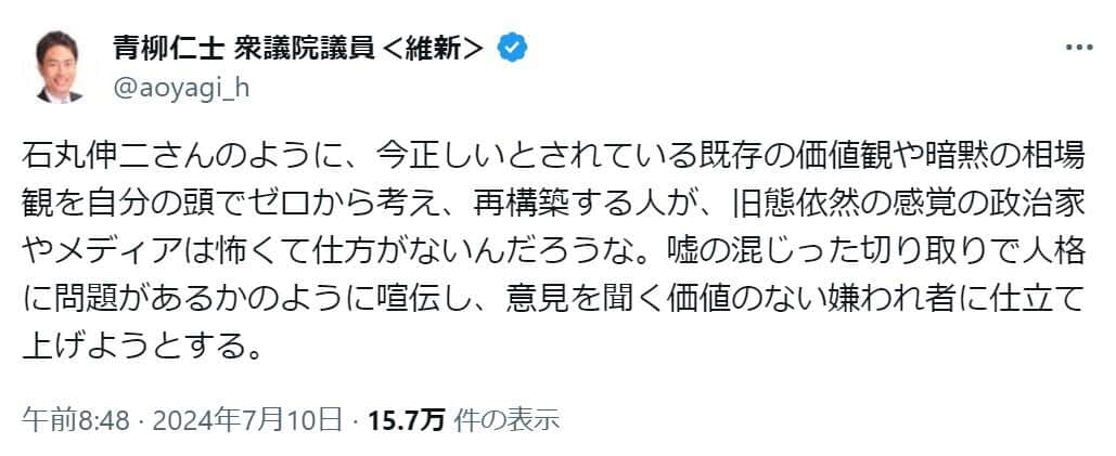 「旧態依然の感覚の政治家やメディアは怖くて仕方がない」 維新・青柳議員、石丸伸二氏批判の声に反応
