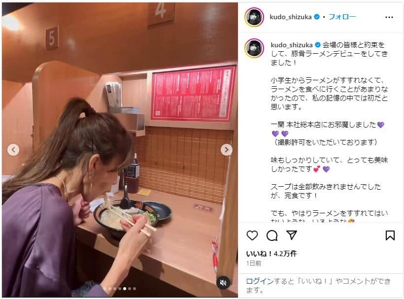 工藤静香、豚骨ラーメンデビュー 「小学生からすすれなくて...」一蘭総本店でチャレンジ動画