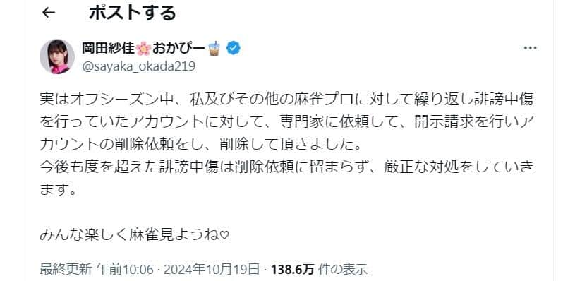 「私も沢山傷つけられて...」美女プロ雀士・岡田紗佳、SNS誹謗中傷に法的措置 真意説明...許せなかった思いとは