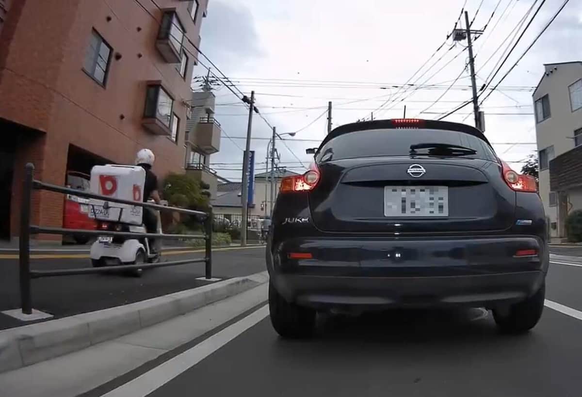 歩道に入る配達バイク(ドラレコライダー@drive_rec_bikeさん投稿の動画から)