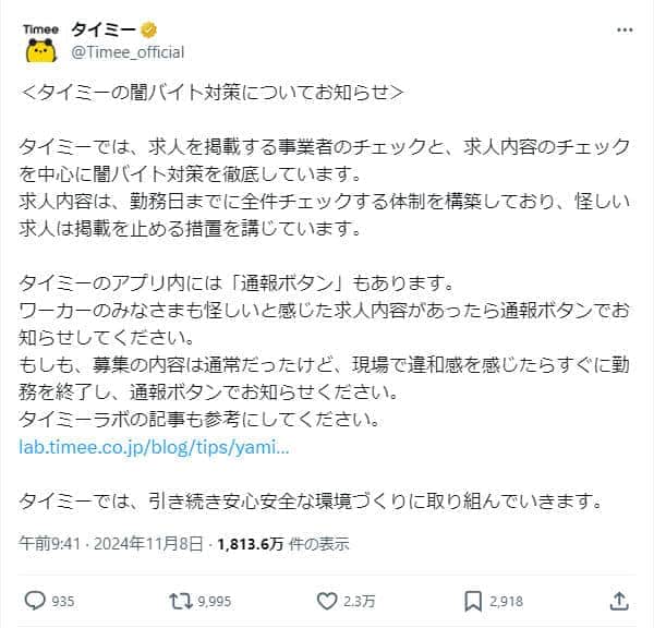 タイミーの闇バイト対策、「『勤務日まで』に求人内容チェック」に疑問の声 なぜ「掲載までに」できないのか