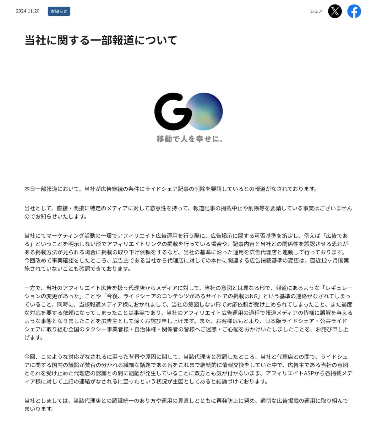 タクシーアプリ「GO」、ライドシェア記事の削除を要請? 広告代理店の認識との間に齟齬と説明