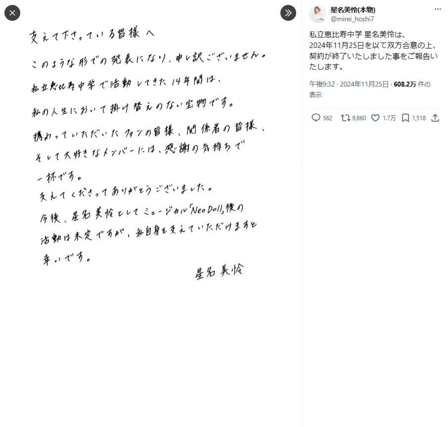 私立恵比寿中学・星名美怜、突然の「契約終了」 残るメンバーは謝罪...ファン衝撃「本当にちょっと待って」