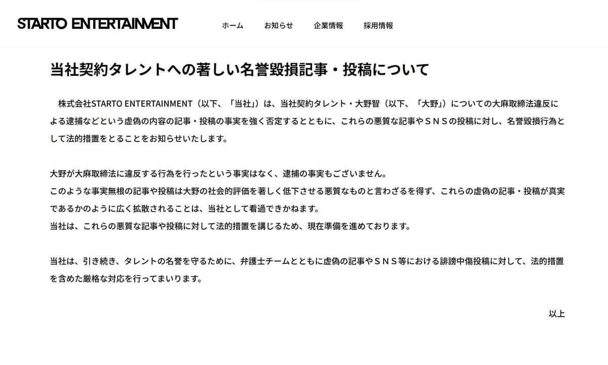 スタート社、嵐・大野智めぐる逮捕情報を否定 名誉棄損には法的措置
