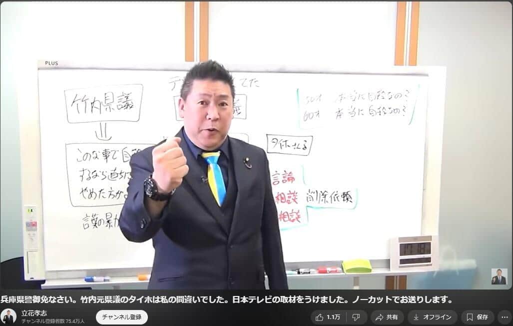 「竹内元県議のタイホは私の間違いでした」 立花孝志氏が発言訂正・謝罪、過激路線は継続