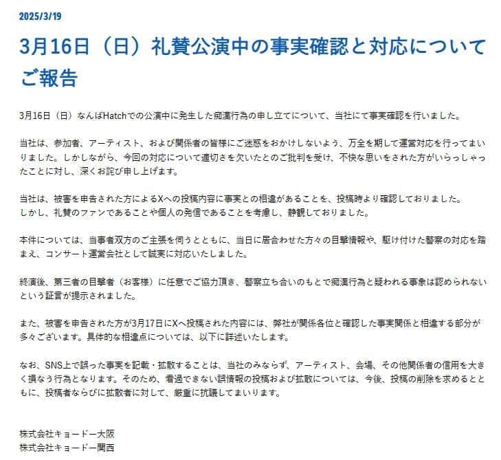ラランド・サーヤ「礼賛」ライブで痴漢を訴える投稿が拡散 運営会社が否定「疑われる事象は認められない」