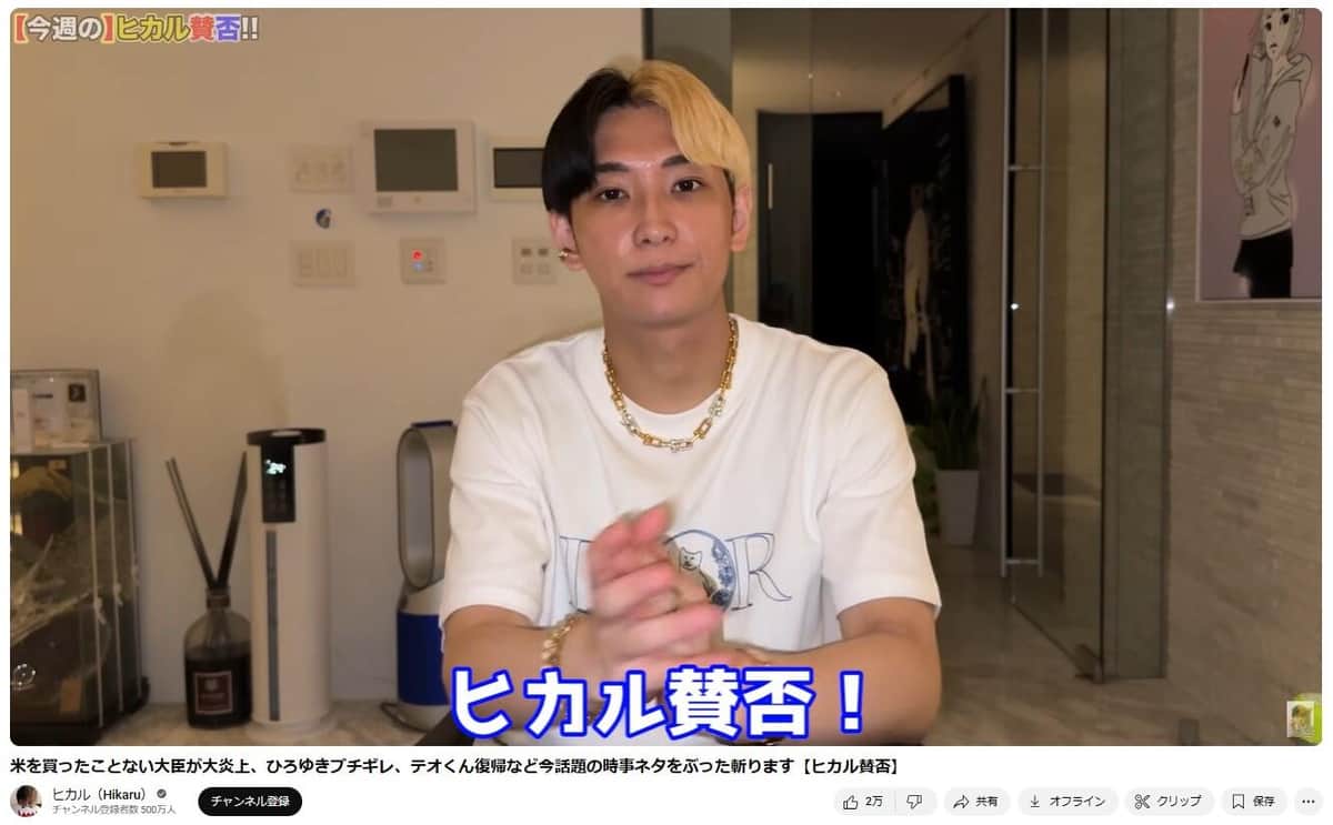 ヒカルさんの動画。恒例の「ヒカル賛否」で持論を展開している