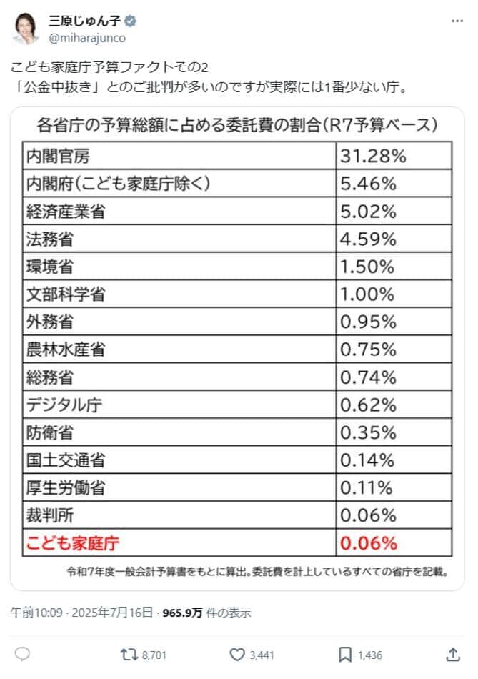 三原じゅん子氏の波紋の投稿、省庁の「公金中抜き」認めた? 指摘に子ども家庭庁が否定「まったくありません」