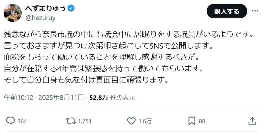 へずまりゅう氏、居眠り議員は「見つけ次第叩き起こしてSNSで公開」宣言