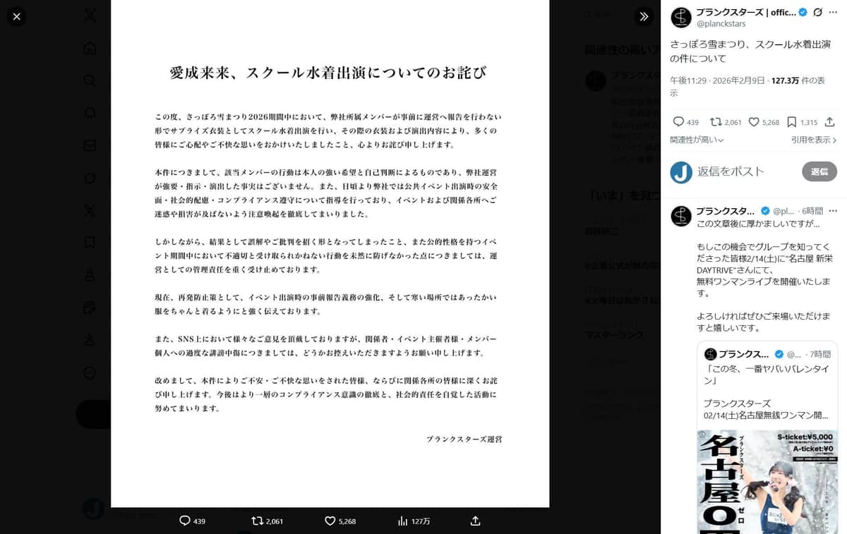 雪の中「スク水ステージ」物議、アイドル運営が謝罪と説明 「サプライズ衣装」「本人の強い希望と自己判断」