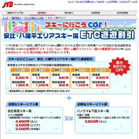 東日本高速道路東北支社(仙台市青葉区)とi.JTB(東京・品川区)は、割安な特典付きドライブ&スキー旅行商品「スキーに行こうcar!安比・八幡平エリアスキー場ETC遊遊割引」を2007年12月26日にJTBホームページ(http://www.jtb.co.jp/kokunai/etc/iwate/)上で発売する。